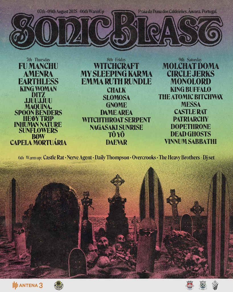 Polo tanto, con inmenso orgullo e entusiasmo presentámosvos a lista final de bandas para o Sonic Blast Fest (+ quecemento) 2025: Molchat Doma, Circle Jerks, Witchcraft, Earthless, Fu Manchu, Amenra, Emma Ruth Rundle, King Woman, Monolord, Heavy Trip, MAQUINA., Chalk, Ditz, King Buffalo, Slomosa, Messa, My Sleeping Karma, Castle Rat (x2!), Dopethrone, JJUUJJUU, Inhuman Nature, Dead Ghosts, Patriarchy, Gnome, The Atomic Bitchwax, Dame Area, Spoon Benders, Witchthroat Serpent, Vinnum Sabbathi, Tō Yō, Daevar, Sunflowers, Nagasaki Sunrise, B∅W, Capela Mortuária, Daily Thompson, Nerve Agent, Overcrooks.